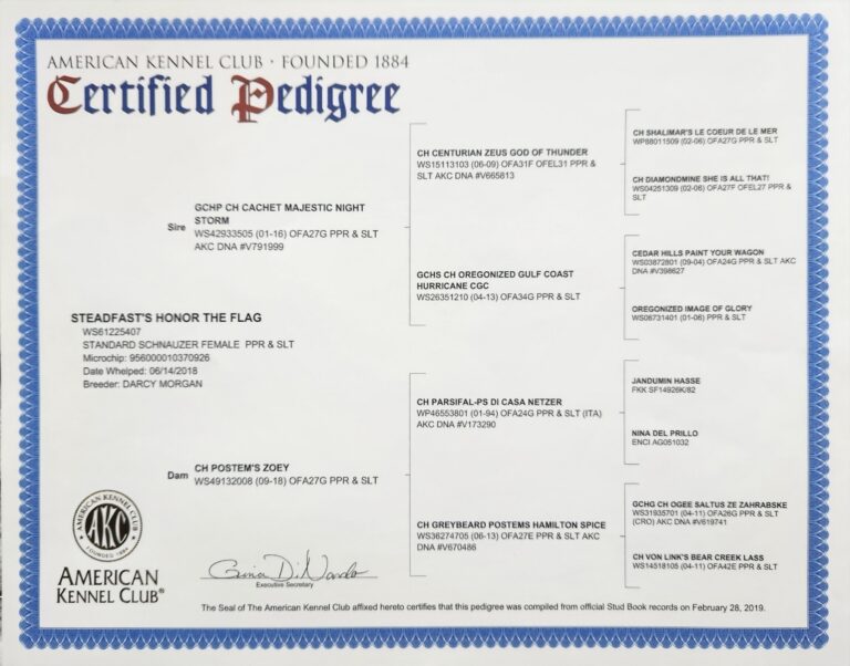 Daughter of Pa, the only Standard Schnauzer to date to have won Best in Show at the Westminster Kennel Club Dog Show. In 1996, Pa, was the top dog in the United States, having defeated 93,725 other dogs across the country. When he retired he had been #1 Standard Schnauzer for 1994, 1995, 1996, and of course the prestigious winner of Westminster Best in Show in 1997. Zoey is our foundation and a gorgeous chip-off-the-old-block.